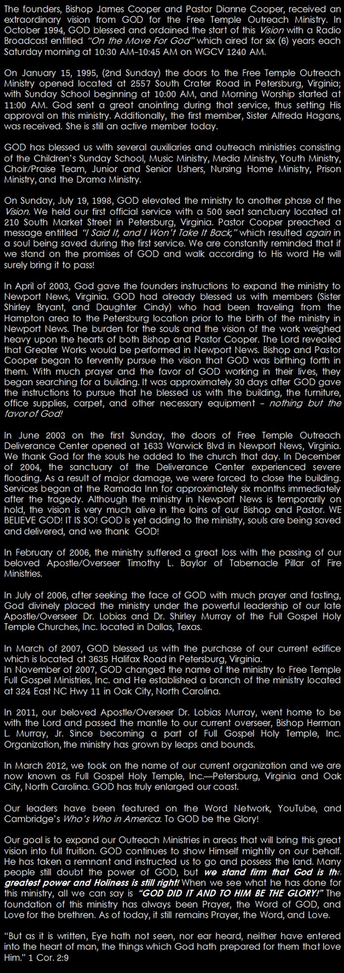 The founders, Bishop James Cooper and Pastor Dianne Cooper, received an extraordinary vision from GOD for the Free Temple Outreach Ministry. In October 1994, GOD blessed and ordained the start of this Vision with a Radio Broadcast entitled “On the Move For God” which aired for six (6) years each Saturday morning at 10:30 AM-10:45 AM on WGCV 1240 AM. On January 15, 1995, (2nd Sunday) the doors to the Free Temple Outreach Ministry opened located at 2557 South Crater Road in Petersburg, Virginia; with Sunday School beginning at 10:00 AM, and Morning Worship started at 11:00 AM. God sent a great anointing during that service, thus setting His approval on this ministry. Additionally, the first member, Sister Alfreda Hagans, was received. She is still an active member today. GOD has blessed us with several auxiliaries and outreach ministries consisting of the Children’s Sunday School, Music Ministry, Media Ministry, Youth Ministry, Choir/Praise Team, Junior and Senior Ushers, Nursing Home Ministry, Prison Ministry, and the Drama Ministry. On Sunday, July 19, 1998, GOD elevated the ministry to another phase of the Vision. We held our first official service with a 500 seat sanctuary located at 210 South Market Street in Petersburg, Virginia. Pastor Cooper preached a message entitled “I Said It, and I Won’t Take It Back,” which resulted again in a soul being saved during the first service. We are constantly reminded that if we stand on the promises of GOD and walk according to His word He will surely bring it to pass! In April of 2003, God gave the founders instructions to expand the ministry to Newport News, Virginia. GOD had already blessed us with members (Sister Shirley Bryant, and Daughter Cindy) who had been traveling from the Hampton area to the Petersburg location prior to the birth of the ministry in Newport News. The burden for the souls and the vision of the work weighed heavy upon the hearts of both Bishop and Pastor Cooper. The Lord revealed that Greater Works would be performed in Newport News. Bishop and Pastor Cooper began to fervently pursue the vision that GOD was birthing forth in them. With much prayer and the favor of GOD working in their lives, they began searching for a building. It was approximately 30 days after GOD gave the instructions to pursue that he blessed us with the building, the furniture, office supplies, carpet, and other necessary equipment - nothing but the favor of God! In June 2003 on the first Sunday, the doors of Free Temple Outreach Deliverance Center opened at 1633 Warwick Blvd in Newport News, Virginia. We thank God for the souls he added to the church that day. In December of 2004, the sanctuary of the Deliverance Center experienced severe flooding. As a result of major damage, we were forced to close the building. Services began at the Ramada Inn for approximately six months immediately after the tragedy. Although the ministry in Newport News is temporarily on hold, the vision is very much alive in the loins of our Bishop and Pastor. WE BELIEVE GOD! IT IS SO! GOD is yet adding to the ministry, souls are being saved and delivered, and we thank GOD! In February of 2006, the ministry suffered a great loss with the passing of our beloved Apostle/Overseer Timothy L. Baylor of Tabernacle Pillar of Fire Ministries. In July of 2006, after seeking the face of GOD with much prayer and fasting, God divinely placed the ministry under the powerful leadership of our late Apostle/Overseer Dr. Lobias and Dr. Shirley Murray of the Full Gospel Holy Temple Churches, Inc. located in Dallas, Texas. In March of 2007, GOD blessed us with the purchase of our current edifice which is located at 3635 Halifax Road in Petersburg, Virginia. In November of 2007, GOD changed the name of the ministry to Free Temple Full Gospel Ministries, Inc. and He established a branch of the ministry located at 324 East NC Hwy 11 in Oak City, North Carolina. In 2011, our beloved Apostle/Overseer Dr. Lobias Murray, went home to be with the Lord and passed the mantle to our current overseer, Bishop Herman L. Murray, Jr. Since becoming a part of Full Gospel Holy Temple, Inc. Organization, the ministry has grown by leaps and bounds. In March 2012, we took on the name of our current organization and we are now known as Full Gospel Holy Temple, Inc.—Petersburg, Virginia and Oak City, North Carolina. GOD has truly enlarged our coast. Our leaders have been featured on the Word Network, YouTube, and Cambridge’s Who’s Who in America. To GOD be the Glory! Our goal is to expand our Outreach Ministries in areas that will bring this great vision into full fruition. GOD continues to show Himself mightily on our behalf. He has taken a remnant and instructed us to go and possess the land. Many people still doubt the power of GOD, but we stand firm that God is the greatest power and Holiness is still right! When we see what he has done for this ministry, all we can say is “GOD DID IT AND TO HIM BE THE GLORY!” The foundation of this ministry has always been Prayer, the Word of GOD, and Love for the brethren. As of today, it still remains Prayer, the Word, and Love. “But as it is written, Eye hath not seen, nor ear heard, neither have entered into the heart of man, the things which God hath prepared for them that love Him.” 1 Cor. 2:9 |